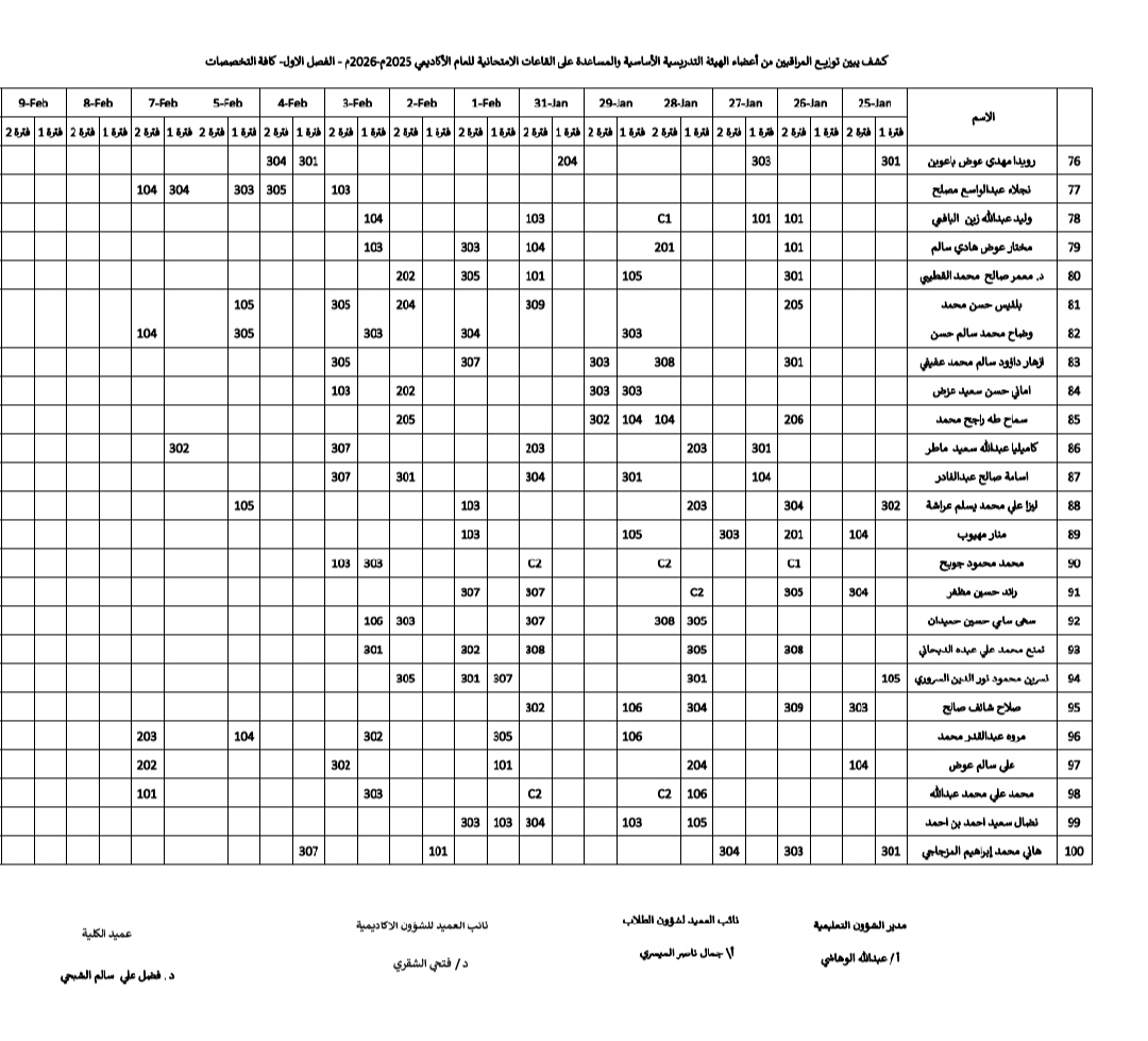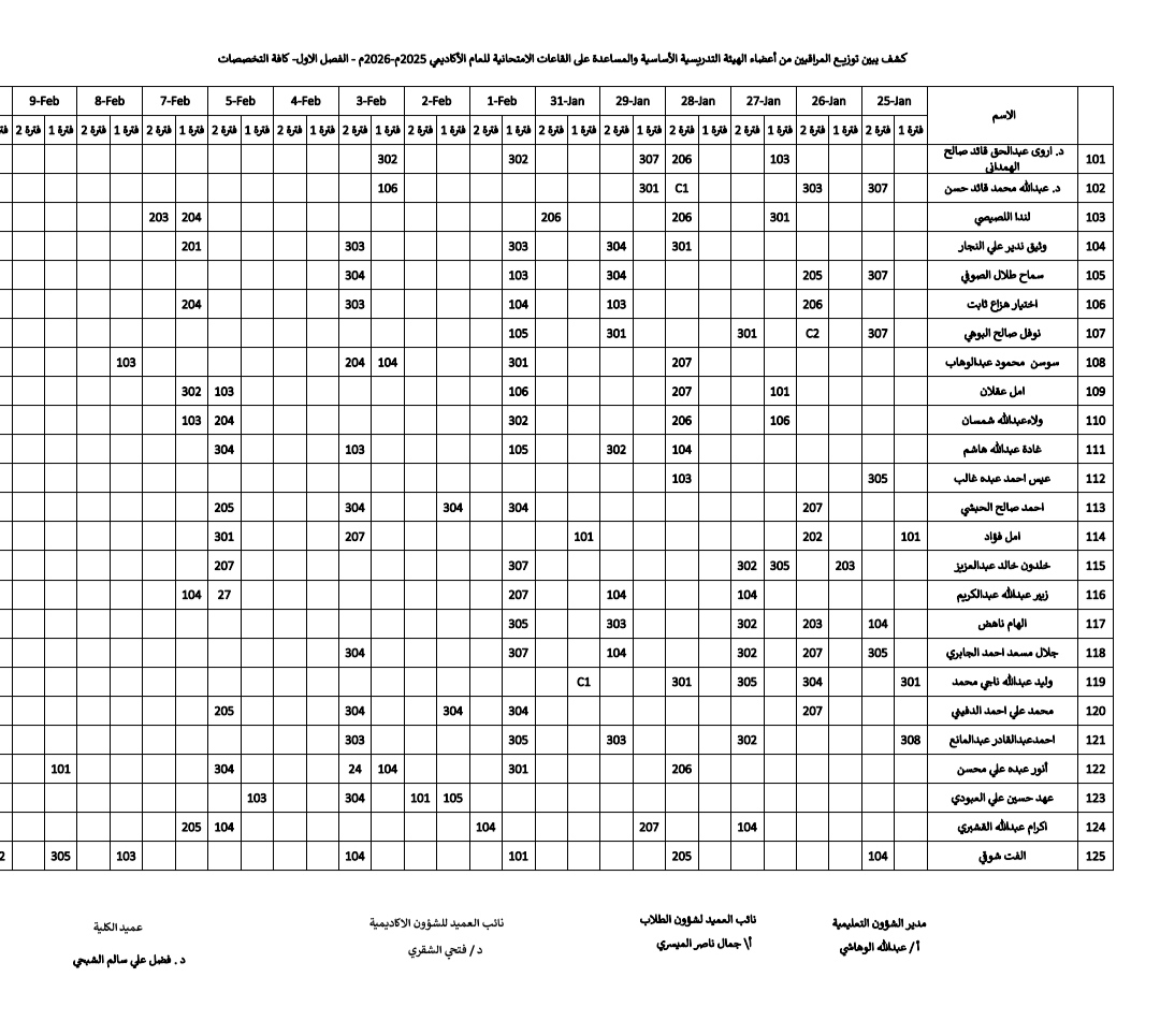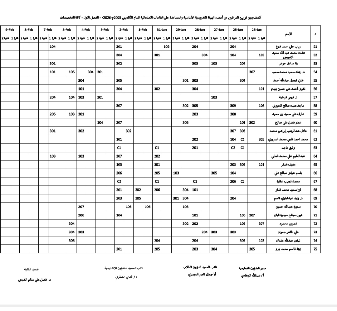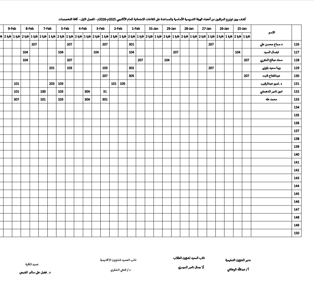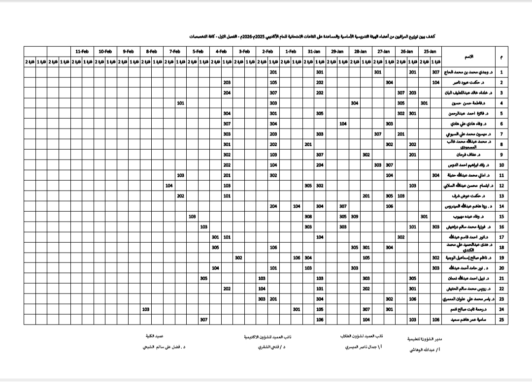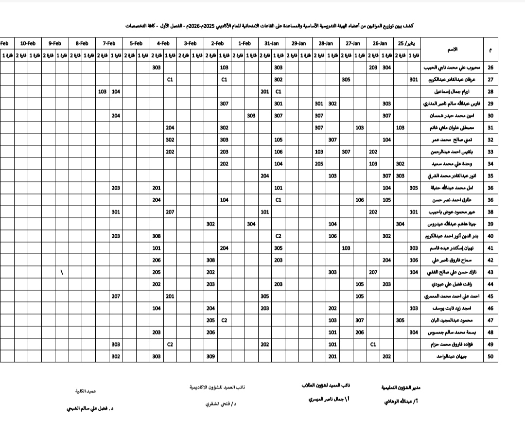 جداول المراقبة لأعضاء الهيئة الاكاديمية لجميع المستويات للفصل الدراسي الاول دور اول للعام 2025-2026م